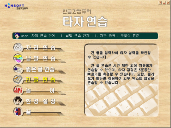 도스 버전에 있던 '낙서장'을 대체하는 기능으로, 긴글연습에 텍스트 파일을 하나 넣어서, 자기가 원하는 걸 타이핑할 수 있다. 그리고 아무래도 상관없지만 저 글들의 제목은 바꿀 수 있어서 장난치기에 용이했다.
