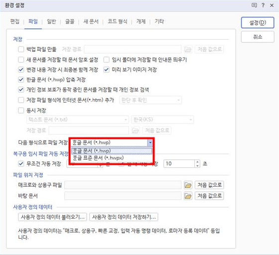 기본 파일 형식은 한글 표준 문서(*.hwpx)입니다.